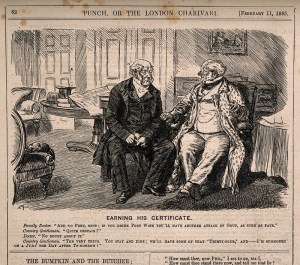 A doctor visiting a patient and advising him against drinking alcohol, the patient responds by inviting him to dinner and some port. Wood engraving by C. Keane, 1865.