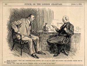 A patient alarmed at his doctor’s request that he abstain from alcohol for a month. Reproduction of a drawing after F. Reynolds, 1925.