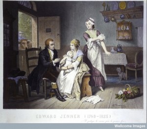 Wellcome Library London L0015950 – Edward Jenner, vaccinating his young child, held by Mrs Jenner; a maid rolls up her sleeve, a man stands outside holding a cow. Coloured engraving by C. Manigaud after E Hamman.