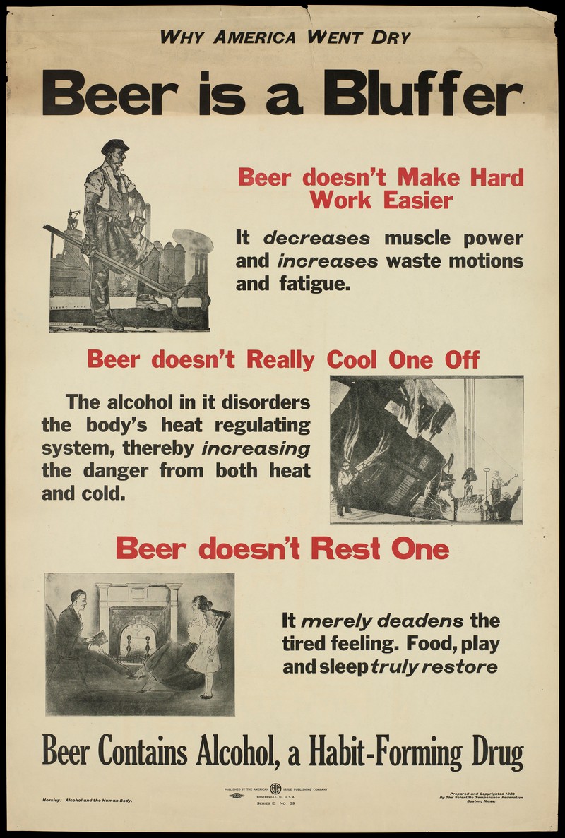 Beer is a bluffer. Beer doesn’t make hard work easier. … beer doesn’t really cool one off. … Beer doesn’t rest one … Beer contains alcohol, a habit-forming drug. Prepared and copyrighted 1920 by the Scientific Temperance Federation, Boston, Mass. Horsley: Alcohol and the human body. Printed in black and red.